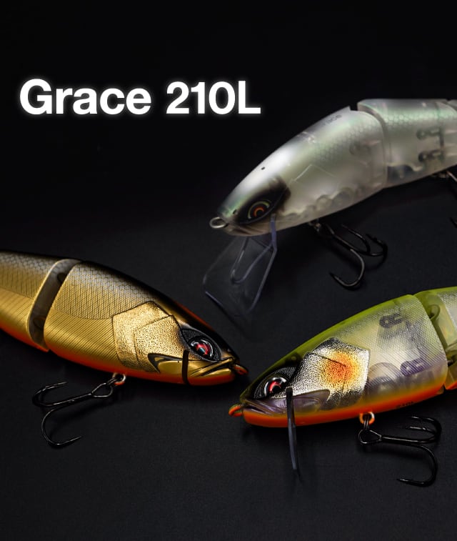 3連ボディが実現する滑らかなアクションとレスポンスの良さを最大限に生かし、高度なクランキングを実現するために誕生しました。 付属する2種類のリップを使い分けることによって多彩なシチュエーションを攻略。クイックリップは目視できるレンジの攻略を得意とし、テンポの良いクランキングや軽快なドッグウォークを実現。 急潜航が持ち味のダイブリップではクランキングで4mラインに到達するほか、シャローエリアのデッドスローリトリーブや回避性能を生かしたボトムノック、ロッドワークによる首振りアクションにも対応します。 木の葉のような形状のリーフテールは本体とは異なるピッチのスイングアクションを発生。ルアーに生命感を宿し、ステイ時には食わせの余韻を生み出します。3連ボディ、リップ、リーフテール。これらの要素が三位一体となり、より高度で繊細なビッグベイトゲームを実現させるために誕生したルアーがGrace210Lです。