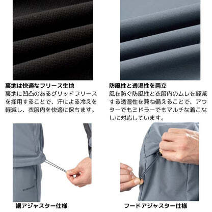 表地には雨風から身体を守る撥水・防風・透湿機能を備えた素材、裏地は肌離れの良いグリッドフリースの2重構造にすることで衣服内の快適さを追求しています。アウターとしてもミドラーとしても使える、秋冬の釣行に最適なアイテムです。