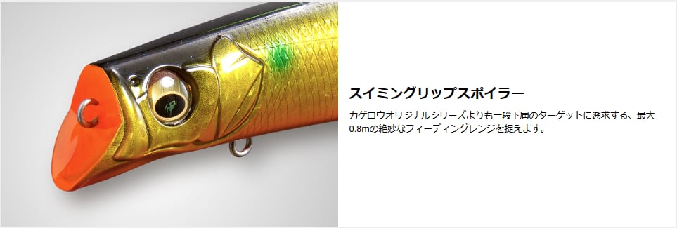 シャロー域や表層域において、ボラや落ちアユ、コノシロ等の大型ベイトが捕食される状況でボリューム感のあるハイアピールボディが絶大な効果を発揮。独自形態のリップスポイラーは、捕食レンジにシビアなモンスターを果敢に反応させるべく、このサイズで最もアジャスト率の高い最大0.8mの絶妙なフィーディングレンジを捉え、オリジナルのカゲロウよりも一段下層の攻略を可能としています。また、強化したダイビング・スタビリティによって、荒れた波風や潮流による水面からの飛び出しを完全に抑え、外洋の磯場やサーフなどラフな環境にも対応。カゲロウ MD 156Fに搭載した重心瞬間移動システムLBOⅡ(PAT.)は、カゲロウMD 125Fと比較してウエイト本体重量を2倍以上も増加。圧倒的質量を持つベアリング内蔵ウエイトがキャスト時に強力な推進ベクトルを発生させ、従来の同サイズルアーの平均的飛距離を格段に凌駕する、超・長距離飛行を実現。リールハンドルに手を掛けた瞬間に、即座にロールアクションが立ち上がる稀代のレスポンシビリティが、圧倒的に攻撃領域を拡大。竿抜けエリアのモンスターに迫ります。