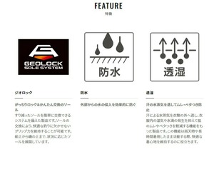 足の甲にホールドテープを採用し、足先に負担が掛かりにくい様になっています。ジオロックも搭載し自分でソール交換も可能。