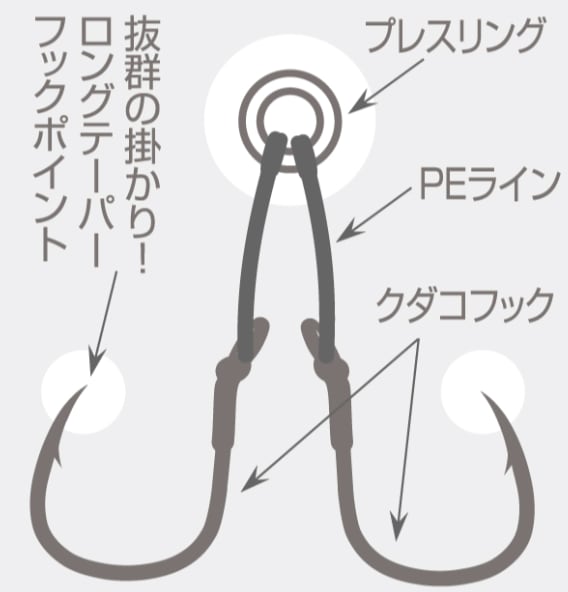 吸い込まれやすく、刺さり込みやすい。ヒラマサのトップウォーターゲームにおいてプラグに取り付けるタイプのアシストフック。トレブルフックと比較して掛けてからのバラしが激減する。少し長めのアシストフック仕様なのでフッキングレスポンスが向上。ショートバイトでもフックが吸い込まれやすい。