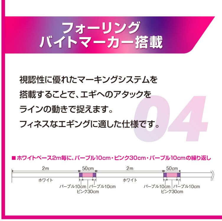 従来の8本撚りに1本の芯を導入することで、ラインの真円性を極限まで高め、ガイドとの摩擦抵抗を大幅に低減。圧倒的な飛距離とスムーズなフォール性能を実現しました。適度な張りがあるため糸絡みトラブルが少なく、エギの操作性も抜群です。ターゲットはアオリイカ。ショア・オフショア問わず、繊細なアタリを逃さない高感度と、不意のデカイカにも対応する強靭な耐久性を兼ね備えた次世代のエギング専用PEラインです。