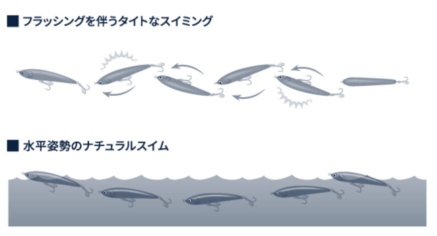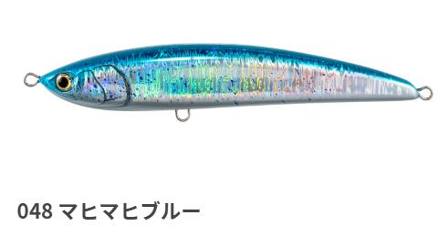 マリアのレガートF230は、青物の捕食スイッチをオンにするジャーク操作後の横跳びアクションが特徴のダイビングペンシルです。ダイブ後のリトリーブでは、ボディを振るわせるタイトなウォブンロールアクションを発生させ、見切られにくい速度での誘いが可能です。マグネット重心移動システムにより、230mmの大型ボディながらクラス最高レベルの飛距離を実現。推奨フックはトリプル#4/0〜5/0、ターゲットは大型のヒラマサやマグロ、キハダです。ラフコンディションでもエラーアクションが少なく、広範囲から魚を呼び寄せます。
