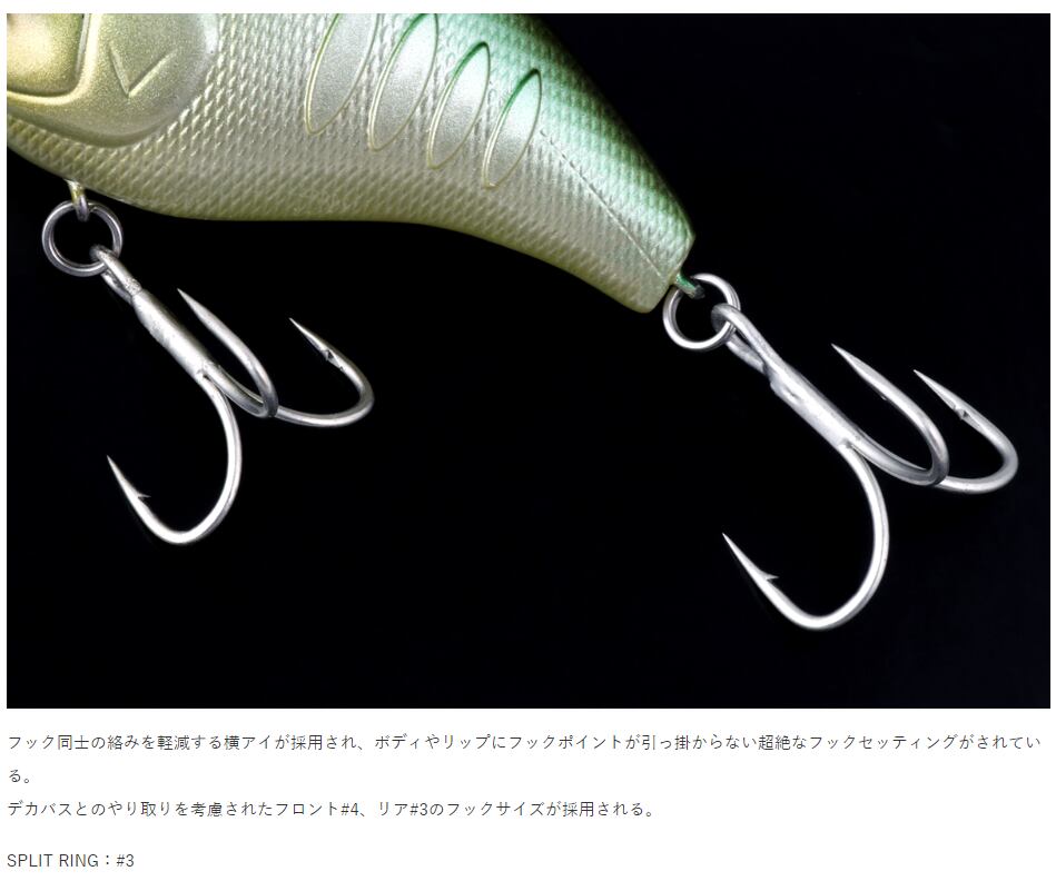 明らかに効いているとしか思えない、ボディ側面のリブから発生する水流攪拌作用が、ビッグバスを引き寄せるだけでなく障害物回避性能を高めた薄型スクエアリップと高浮力ボディは、ストラクチャーにコンタクトしても即座に体勢を立ち直す優れたレスポンスをもたらし、根掛かりなどの無駄なトラブルを軽減する事でより多くのバイトチャンスを導きます。
