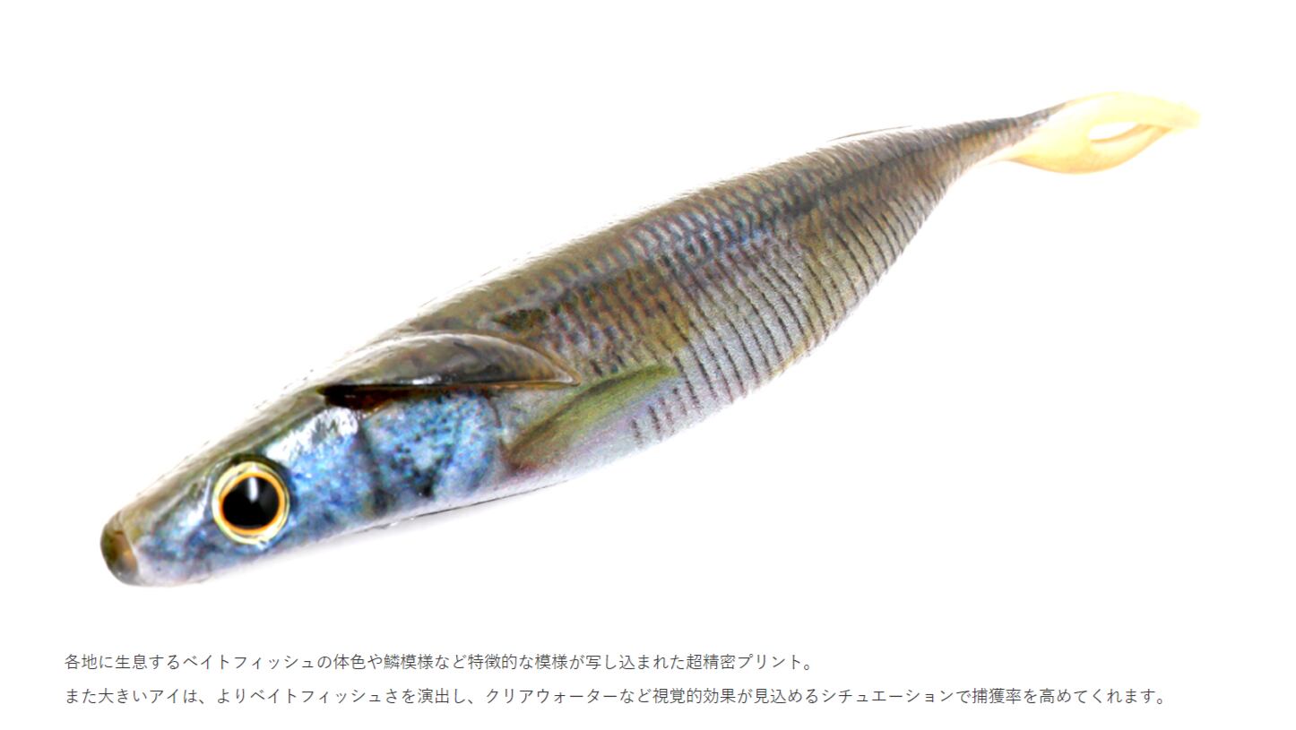 あたかもベイトフィッシュに見間違えてしまう、リアルな超精密プリントが施された『サカマタシャド・リアル』。