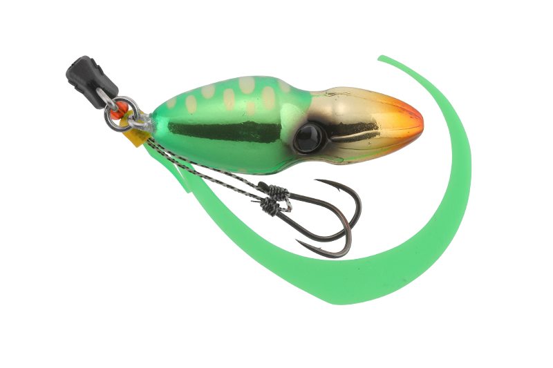 ヘッド、スカート、ネクタイが一連の従来の漁具型ルアーと異なり、ボディとネクタイ+フックを別パーツとして構成。さらに並列にセットしボリューム感を抑えたことでコンパクト化を実現。ボディへのバイトもフッキングに持ち込みます。