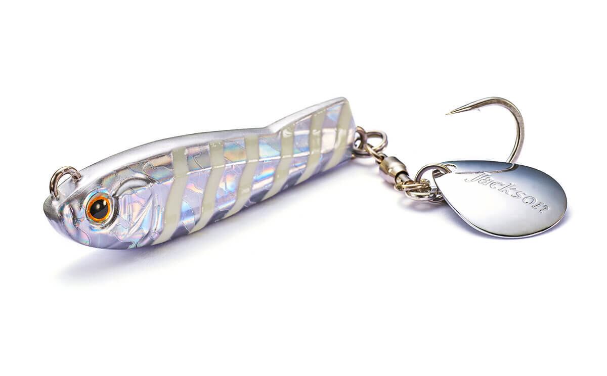 広範囲に点在したサゴシ・サワラを初めとした青物を狙うため、ガイド船アンリミテッドの池上日明が監修したブレードジグ「メタルエフェクトサゴシチューン」。アイの位置やウェイトバランスを調整し、フォール姿勢と高速リトリーブでの直進安定性能を向上。ルアー後部に採用されたフィンが姿勢の安定性をさらに高めます。青物は遊泳スピードが速く、ヒットした瞬間にフックへ掛かる重量が大きいため、トリプルフックよりも強度の強いシングルフックを採用。ナブラや跳ねがなく、どうしてもターゲットが浮かない日のシークレットルアーとしてお使いください。
