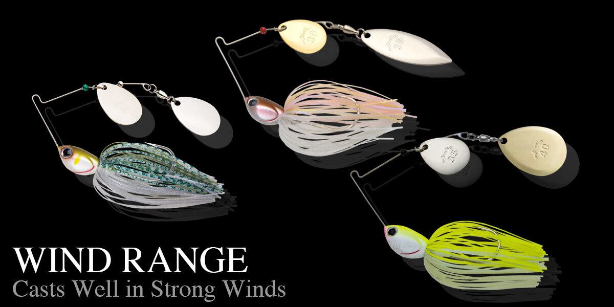 スピナーベイトパターンを成立させる重要な要素である”風”。アングラー側にとっては不都合も多い”風”を味方につけるアイテムが「ウインドレンジ」です。横風や強風下でもキャストしやすいコンパクトボリュームの中に、スピナーベイトに求められる要素を凝縮。根がかりしにくい姿勢でスイミングさせるベンドアーム。アングラーへ明確にバイブレーションを伝え、コントロール性を高める”V-ブレード”。キャストで風の抵抗を減らして飛距離を稼ぐワンサイドスカート。そのどれもが風に負けることなく、風と共に投げ続けるアングラーのためのセッティングです。またそのショートアームスタイルゆえに、フリーフォールでのブレード回転も秀逸。リザーバーでのバンク撃ちや縦ストラクチャーに沿ったフォーリングなどにも優れたアイテムとなっています。