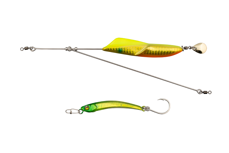 天秤形状をしたジェットローMID本体で飛ばし、テールに装備されたコロラドブレードで魚を寄せ、その後方を追うように泳ぐシラスサイズのバディ(喰わせルアー)にバイトさせるという仕組み。マイクロサイズのルアーに足りない飛距離だけでなく、アピール力も補うことができます。