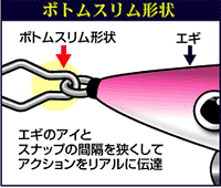 エギのアイとスナップの間隔を狭くし、ラインを通じて来るアクションをリアルにエギに伝えるボトムスリム形状。